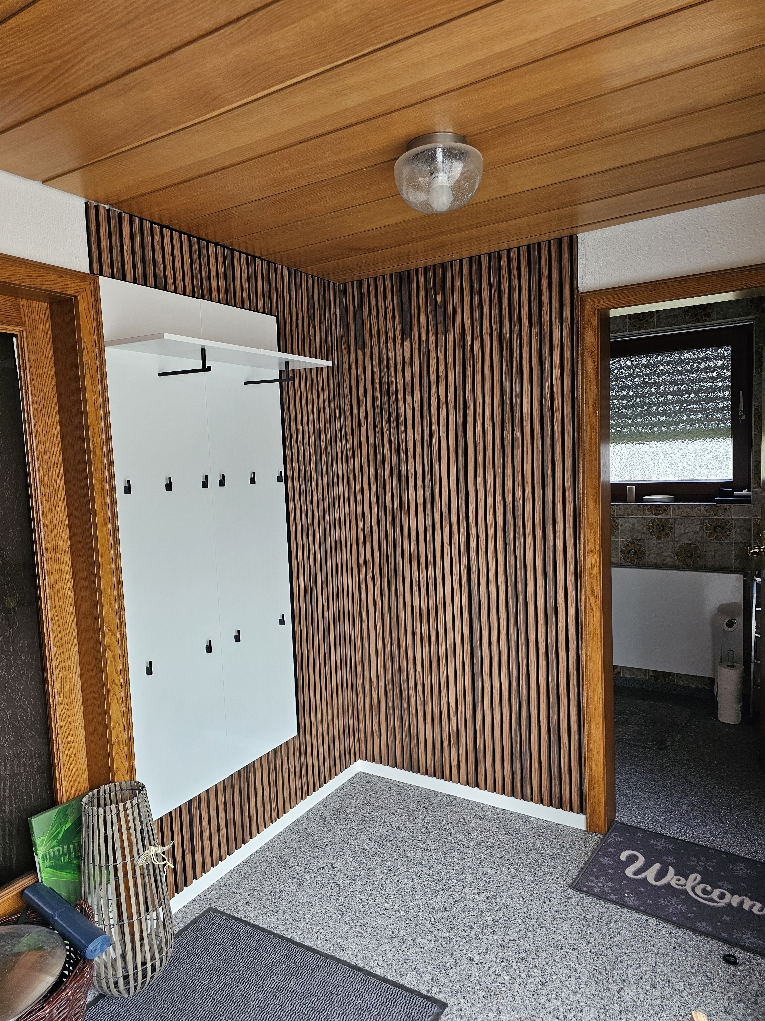 Heute den freien Tag, sowie das noch gute Wetter genutzt und den vorerst letzten Handschlag im Erdgeschoss genutzt. In einer Ecke des Flurs sollten noch Akustikpaneele an die Wand.